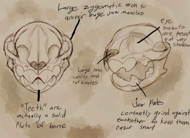 -An eyeless, rounded head with large teeth. (Some individuals may have a short muzzle/snout.)-Thick and powerful forearms with large hands/claws/paws (no hooves).- Relatively short hindlegs with wide hips. (Hindfeet can be hooves, paws, or even fins!)- At least two ears, of any shape or size.- At least four (two on each side) respiratory holes. (These can be located anywhere on the body, but are typically on the neck or ribcage)- At least two facial antennae.- No taller than 5ft on their hindlegs